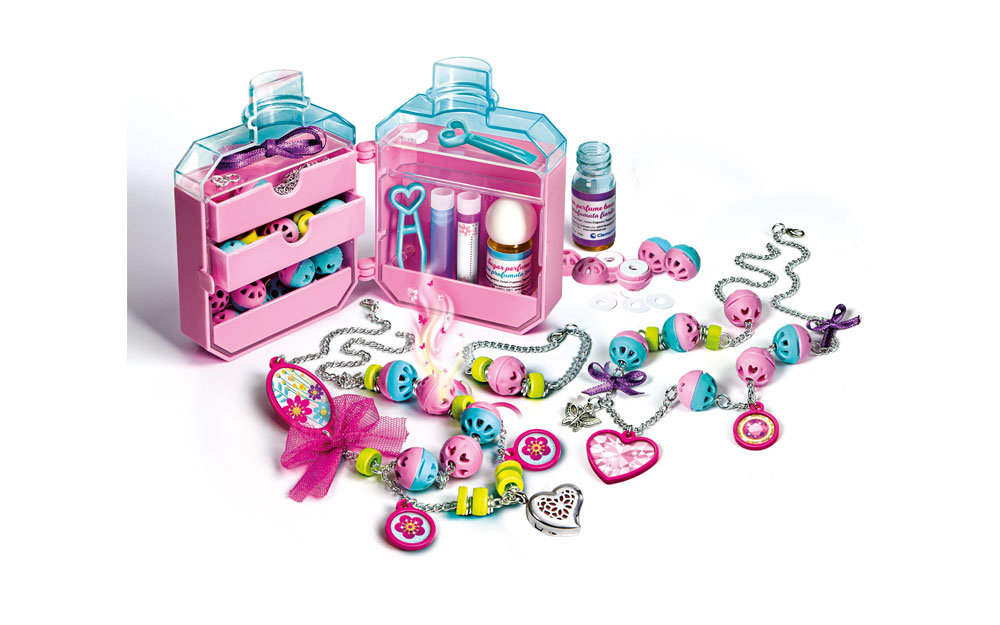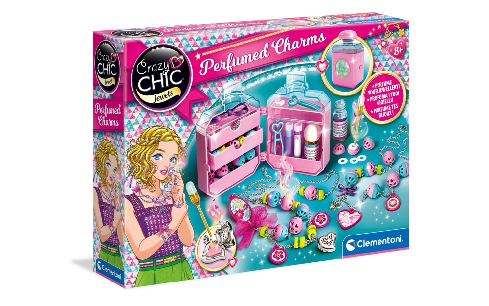 Set Perfumed Charms Crazy Chic, Clementoni je oduševio curice diljem svijeta. Od priloženih dodataka mogu izraditi jedinstvenu narukvicu ili ogrlicu te ih namirisati priloženim parfemima. Komplet sadrži 2 parfema, pipete, naljepnice, epruvete, staklenu bočicu u obliku klasične parfemske bočice te dodatke za izradu narukvica i ogrlica.
