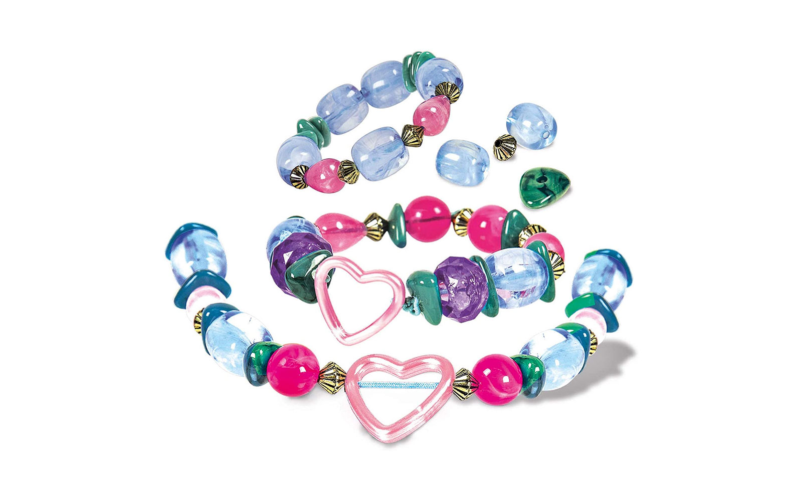 Set sadrži kuglice u mnogo različitih oblika i boja za stvaranje super glamuroznih modnih narukvica.
